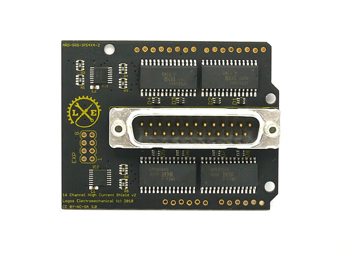 The Logos Electromechanical ARD-SRG-IPS4X4 16 channel high current Arduino shield is designed to enable users to switch DC loads up to 5A at up to 30V with no heat-sinking. It is ideal for such applications as driving solenoids, relays, and small DC motors. It uses in the International Rectifier IPS6044 quad channel fully-protected high side MOSFET switches, which includes over-temp, over-current, and under-voltage protection on each switch. The high-side topology is safer in many applications than the more common low-side topology because a short to ground cannot energize the circuit while the switch is turned off, as it can with a low-side switch. This shield can also be used to drive four unipolar stepper motors.