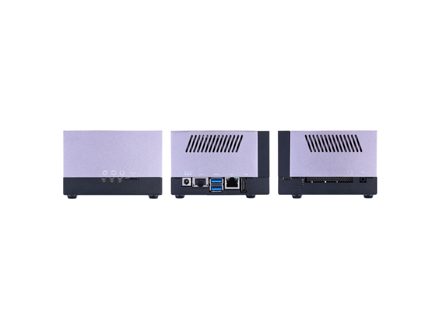 • Hand-size edge AI device: compact size at 107mm x 106.4mm x 70.5mm, includes Jetson AGX Orin™ production module, a heatsink with a cooling fan, enclosure, and a power adapter.