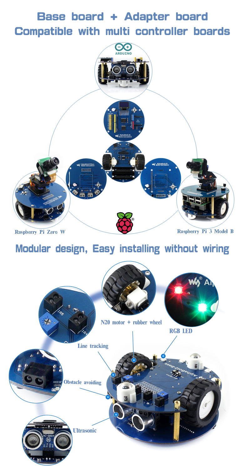 This AlphaBot2 robot kit is designed to use with an Arduino compatible controller (not included). It features rich common robot functions including line tracking, obstacle avoiding, ultrasonic ranging, infrared remote control, Bluetooth communication, etc.