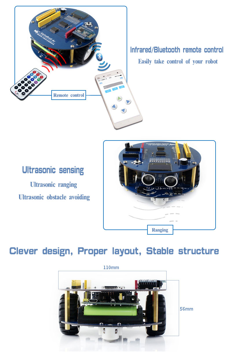 This AlphaBot2 robot kit is designed to use with an Arduino compatible board UNO PLUS. It features rich common robot functions including line tracking, obstacle avoiding, ultrasonic ranging, infrared remote control, Bluetooth communication, etc.