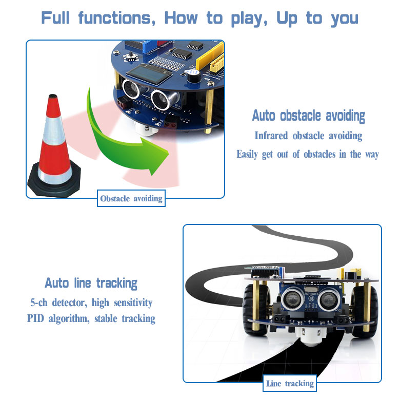 • Onboard modules like line tracking, obstacle avoiding, needs no messy wiring