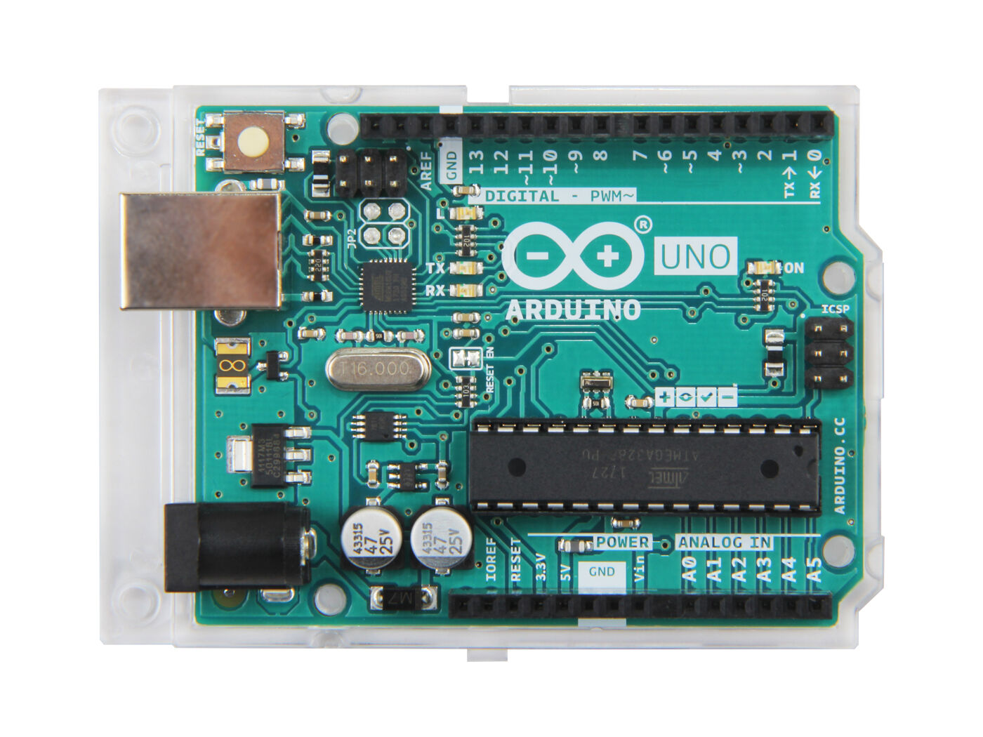 The Arduino UNO is the best board to get started with electronics and coding. The Arduino Uno Rev 3 is a microcontroller board based on the ATmega328, an 8-bit microcontroller with 32KB of Flash memory and 2KB of RAM, which is the most used and documented board of the whole Arduino family.