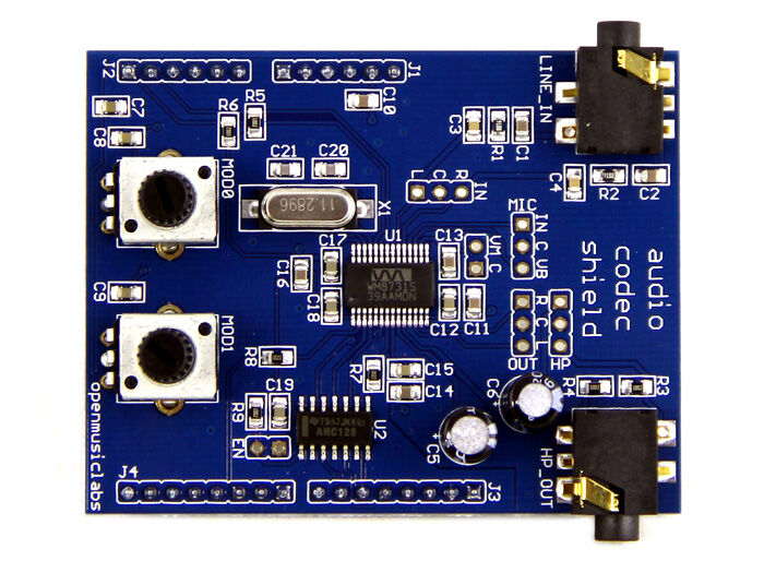 The Audio Codec Shield is an Arduino shield that uses the Wolfson WM8731 codec, capable of sampling and reproducing audio up to 88kHz, 24bit stereo. The Audio Codec Shield has 1/8″ stereo input and headphone output jacks, a single pole analog input aliasing filter, and 2 potentiometers for varying parameters in your code. (Check out the wiki page for the Arduino and Maple code libraries.)
