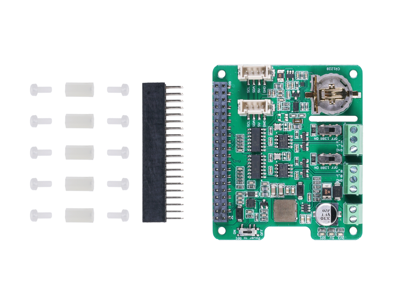 You can power this shield via your Raspberry Pi’s 40 pin header, or you can use the 12 – 24V DC screw terminal to supply the power for the whole system.  To ensure the stability of communication, we’ve used high-quality Panasonic capacitors and TI power chips, along with quality circuit design, to build a stable power management system, which provides stable 3.3V and 5V power supply for all parts of the system.