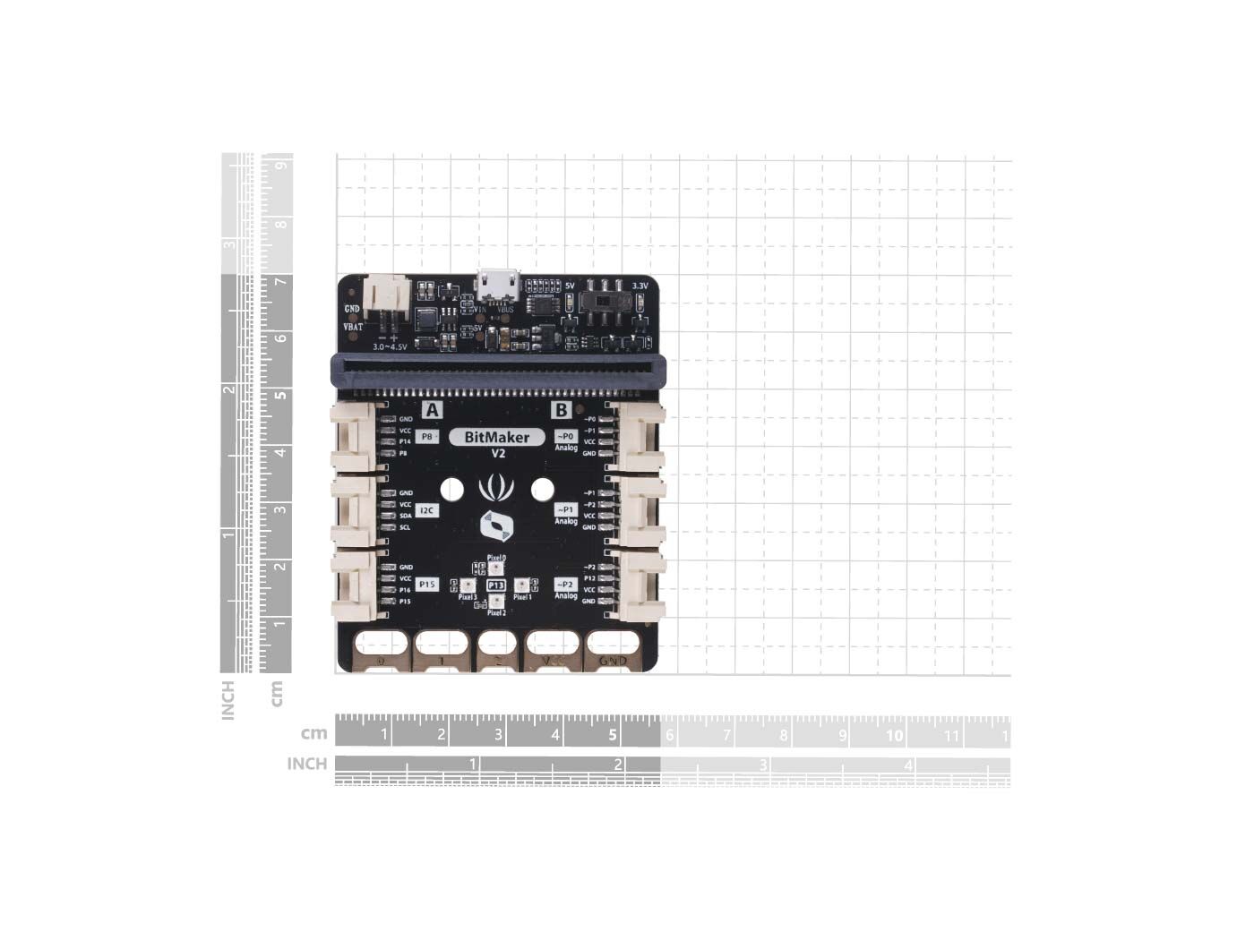 The BitMaker V2 is an upgraded BitMaker expansion board designed for micro:bit where it has been equipped with JST 2.0 battery connector and an updated slot for better holding alligator clips. The usage is of it as straightforward as it can be easily sliding into the micro:bit. With built-in a programmable RGB LED, a power switch, a power indicator, on-board Grove modules connectors, and JST 2.0 battery connector, BitMaker V2 ensures the micro:bit be able to apply various functional Grove series which provides beginners more options in regard to the micro:bit projects, or helps them extend their original demos like adding an external battery to apply additional wireless function.