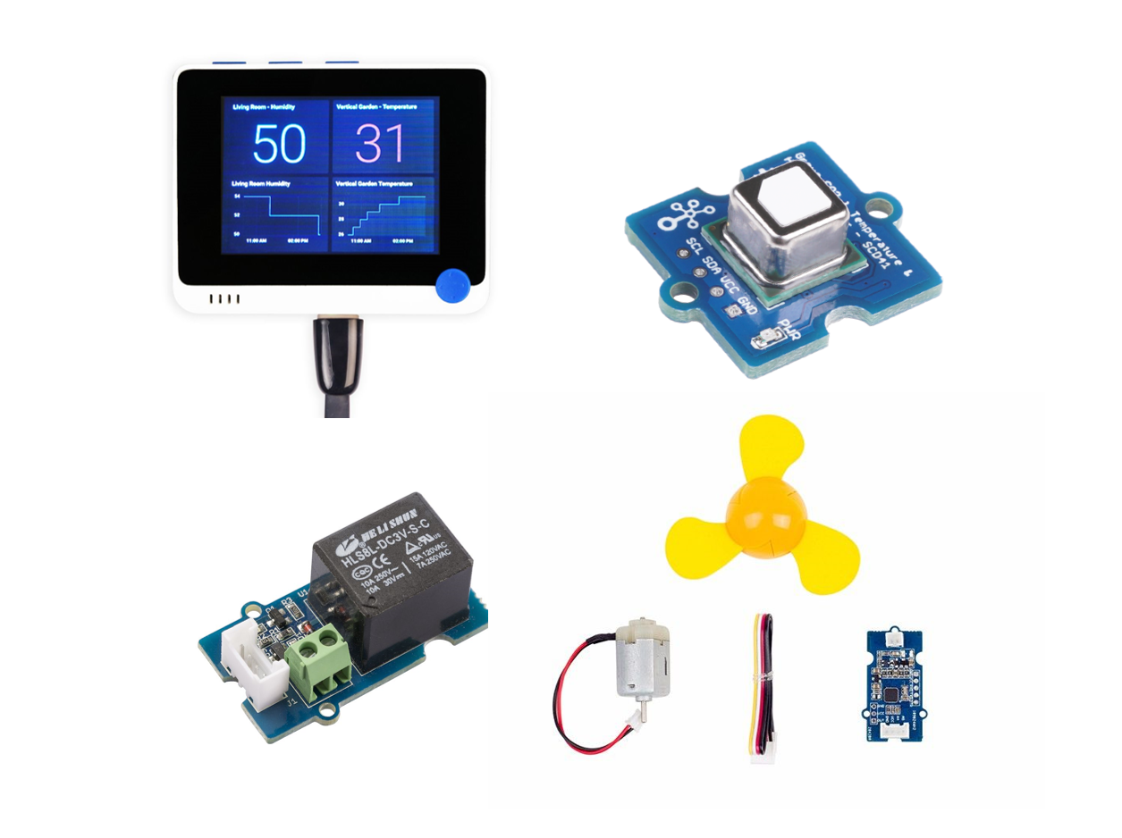 The kit provides the components needed to implement the CO2 levels monitoring and Airflow control system. The kit includes WioTermianl, Grove-CO2 & Temperature & Humidity Sensor, Relay, Mini Fan, etc. The system can continuously detect and monitor the carbon dioxide level in the living room or bedroom and control the ventilation fan to improve airflow.