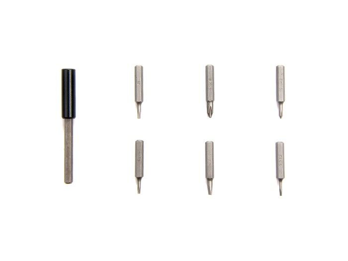 It comes with 1 x Screwdriver Head Extension Rod and 6 x popular bits Bits: PH0000, PH1, SL1.5, SL3.0, T5, T6. A quick-change chuck makes changing bits easy on this power screwdriver. The chuck is compatible with all micro (4mm) bits.
