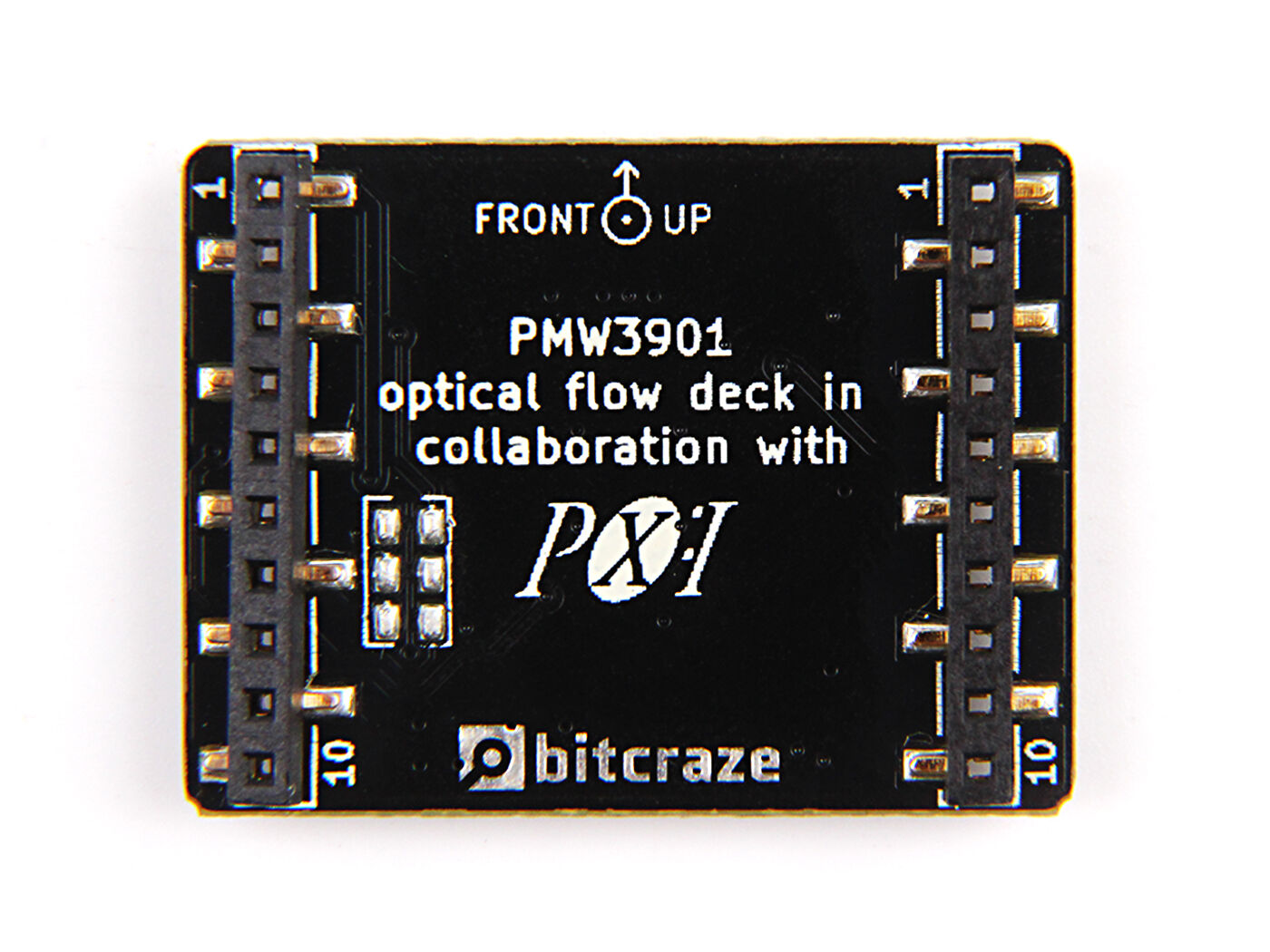 The Flow deck gives the Crazyflie 2.0 the ability to detect its motions in any direction. The VL53L0x ToF sensor measures the distance to the ground with high precision and the PMW3901 optical flow sensor measures movements of the ground.