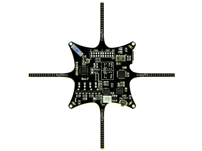 The Crazyflie Quadcopter is shipped pre-programmed but can easily be wirelessly updated via a radio bootloader from a host PC, so no JTAG is required for reprogramming. For advanced development and debugging there’s also an accessible JTAG interface.