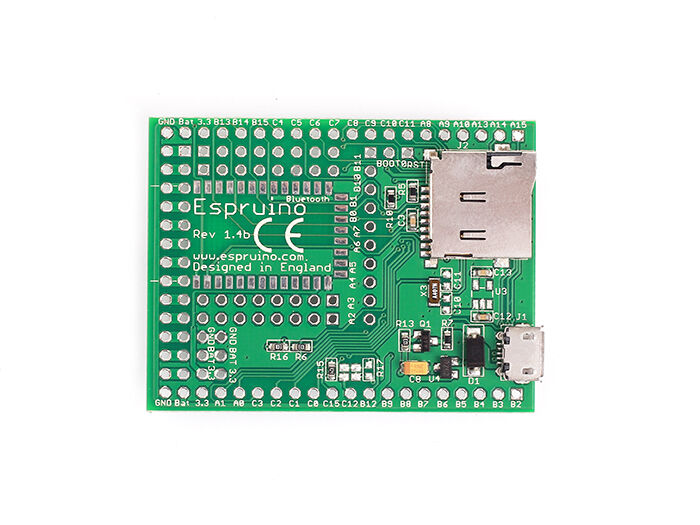 Solder an HC-05 Bluetooth module (not included) directly onto the board and program and debug Espruino wirelessly!
