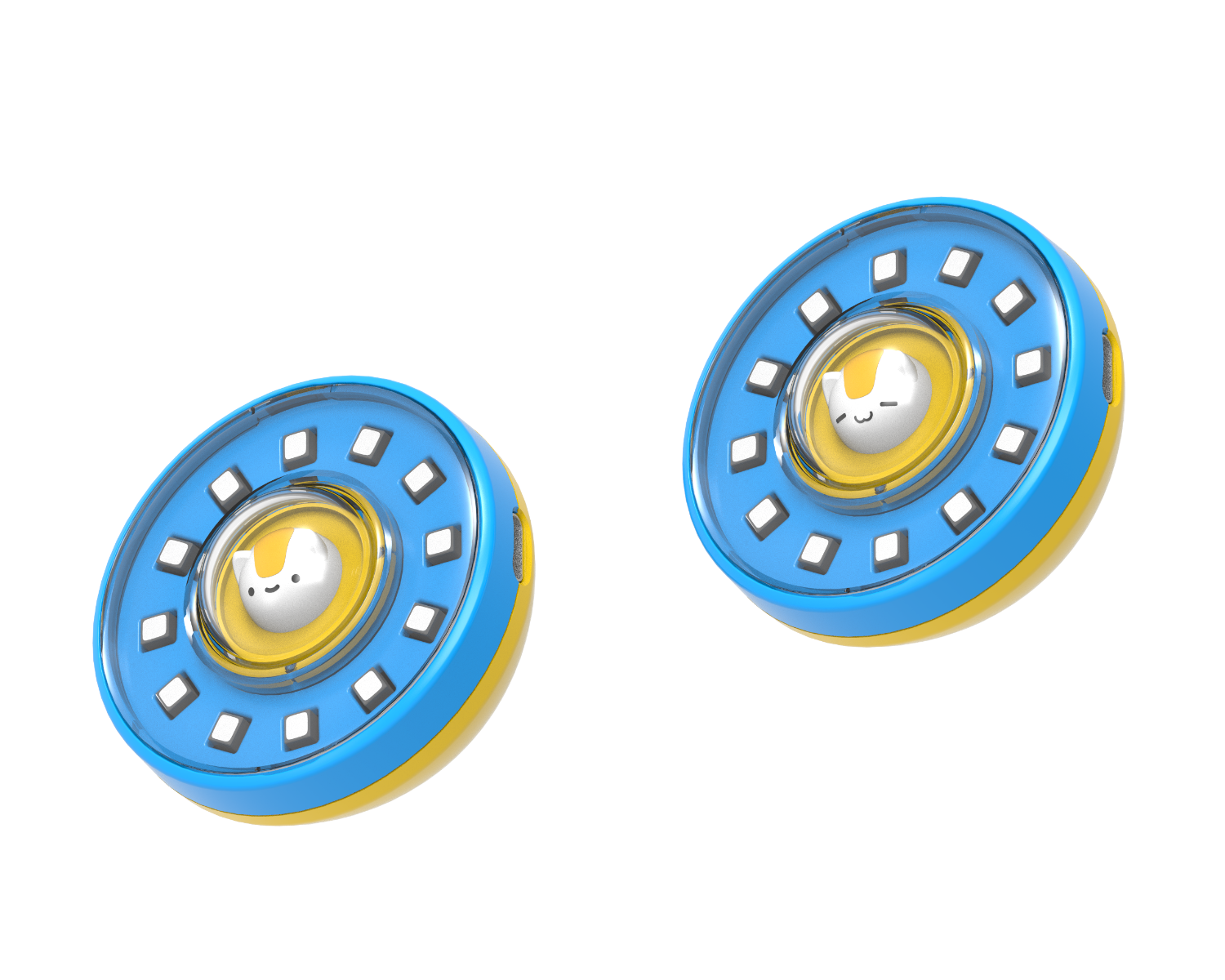 The shape design of Glint is inspired by a classical “flying saucer shape”, which gives it a mysterious and high-tech look. The “cargo space” in the middle of the disc is actually a push button and the pilot character inside can be swapped as desired. The Three-axis accelerometer can detect a variety of motions, for example, punch, shake, fall, and so on.