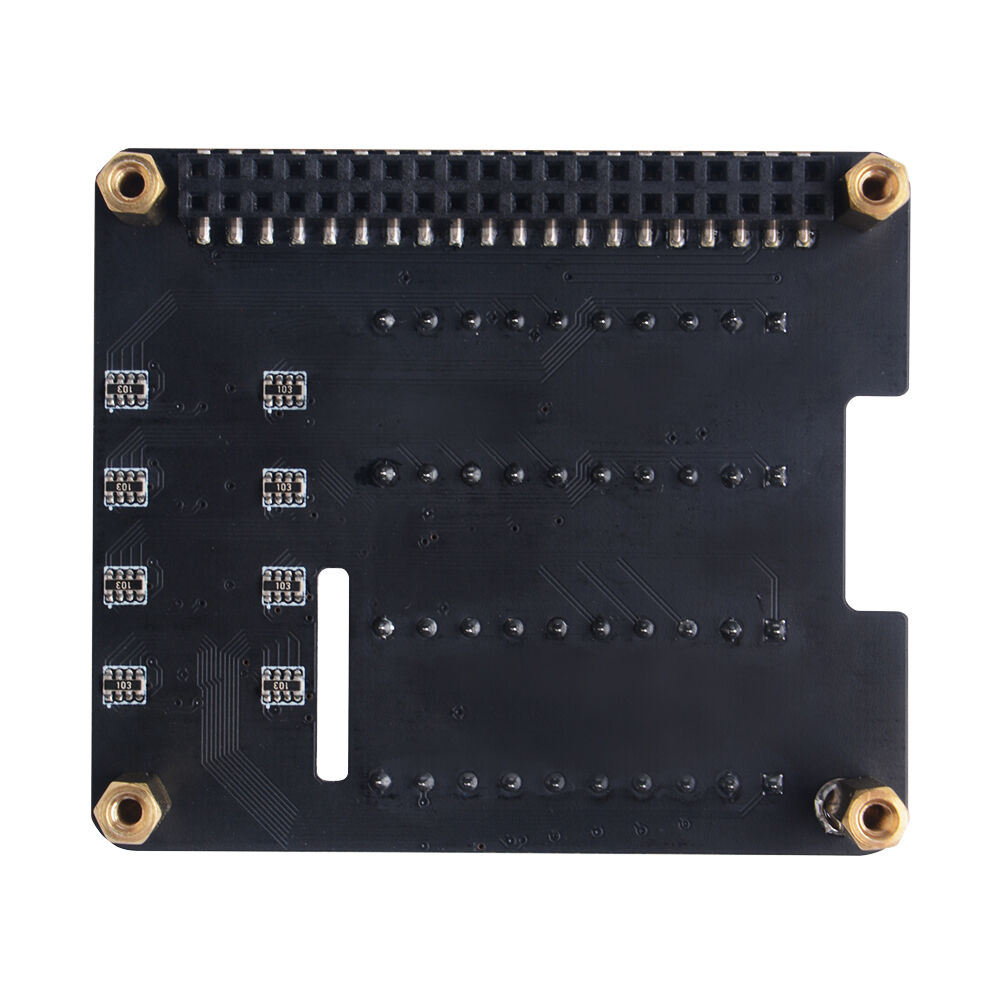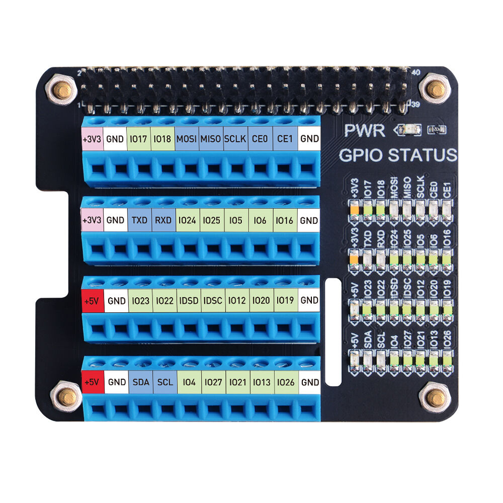 This is a very beautiful screw terminal expansion version, which is expanded for the pins of the Raspberry Pi. It is convenient for everyone to connect when doing electronic experiments. There is the pinout information of the GPIO pin on the top of the terminal and on the side. The status information of the pin is displayed. When the GPIO pin is operated and effective in the terminal, the LED matrix on the right side of the terminal will display the status of the GPIO pin, and some distinctions are made in the color selection of the LED lights.