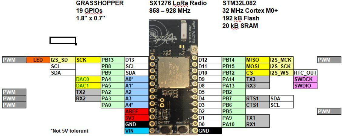 This is Grasshopper, a small (0.71 ” x 1.76″) development board with Murata’s CMWX1ZZABZ-078 FCC certified module containing ST Microelectronics’ STM32L082 32 MHz Cortex M0+ MCU with 192 kByte of flash and 20 kBytes of RAM and Sematech’s SX1276 LoRa radio. The development board exposes 19 GPIOs to the user as well as 3V3, GND, VIN, and VREF (for the analog sector), has an indicator led on GPIO 13 as well as a power-on led that can be disabled via a solder jumper for lowest power usage, and has an on-board antenna suitable for either 868 or 915 MHz.