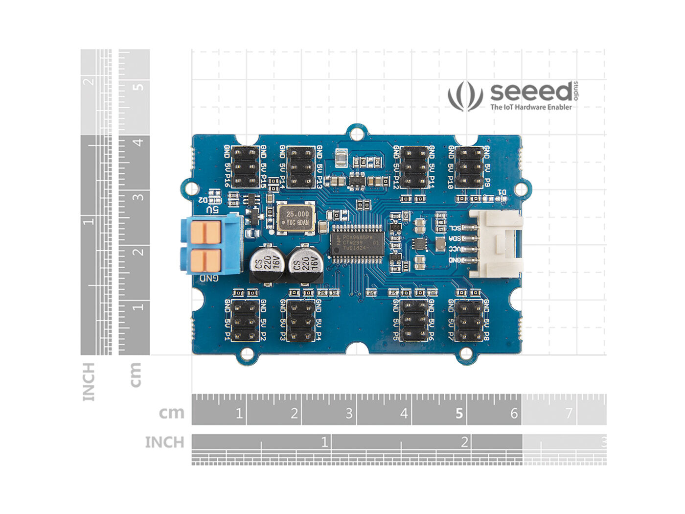 Based on the features of NXP PCA9685, this PWM driver board can well meet the needs of multi-channel PWM projects, such as a hexapod walker. Additionally, you can use this board as a LED controller. You can easily control this driver board through the I2C Grove interface.