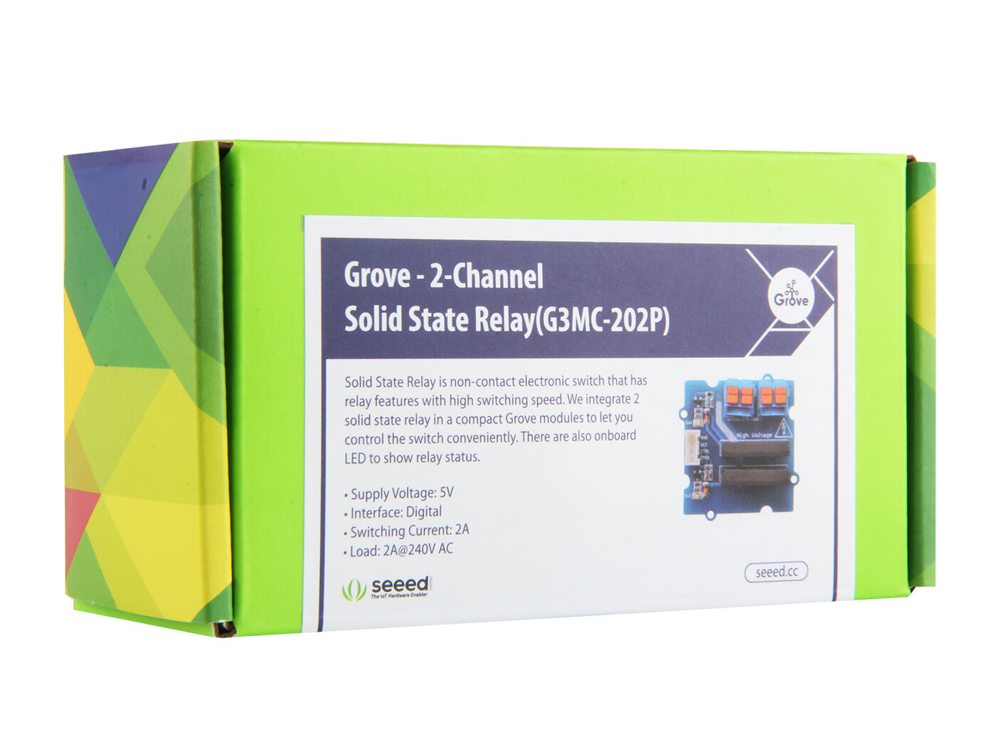 Instead of using coil, packaged solid-state relays(SSR) use power semiconductor devices such as thyristors and transistors, which provide a much faster switching speed than the mechanical relays. The Grove – 2-Channel Solid State Relay is based on the high-quality G3MC202P module, which allows you to use a 5VDC to control MAX. 240VAC. This module has two channels, you can control them separately. With the help of Grove interface, it becomes very convenient to use the SSR with your arduino.
