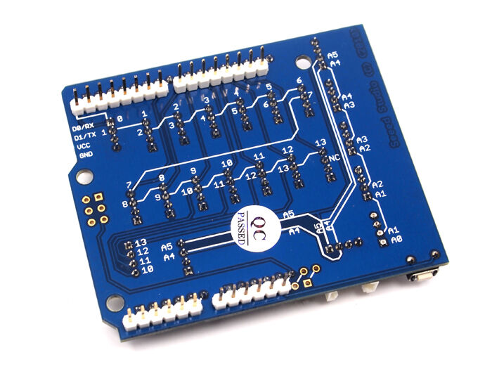This is the new version of Electronic Brick Shield. We standardize all the connectors into 4 pins(Signal 1,Singal 2,VCC and GND) 2mm connectors, which simplify the wiring of electronics projects. The 4pins buckled connectors also make the wiring situation more stable. We build all kinds of Twigs to match up with Stem, still don't you need to worry about the compatibleness between stem and your existing Electronic Bricks.We have many kinks of converter cables(still increasing) to deal with the compatibleness.This is very similar in fashion to an Arduino shield board, and in fact is used as such with our Seeeduino or Mega board.In v1.0b, we move in the analog connectors a little so that it will fit the higher power connector and USB connector.