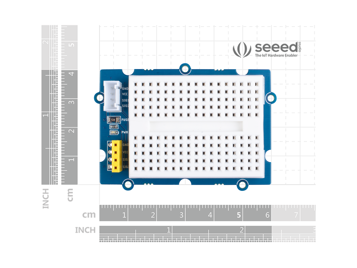This is a breadboard sized in 35*47*8.5mm with metal strips underneath the board and then connect the holes on the top of the board. There is also a Grove connector on the board to allow you to build your very own Grove – module, and therefore will take you to a new level of creativity!