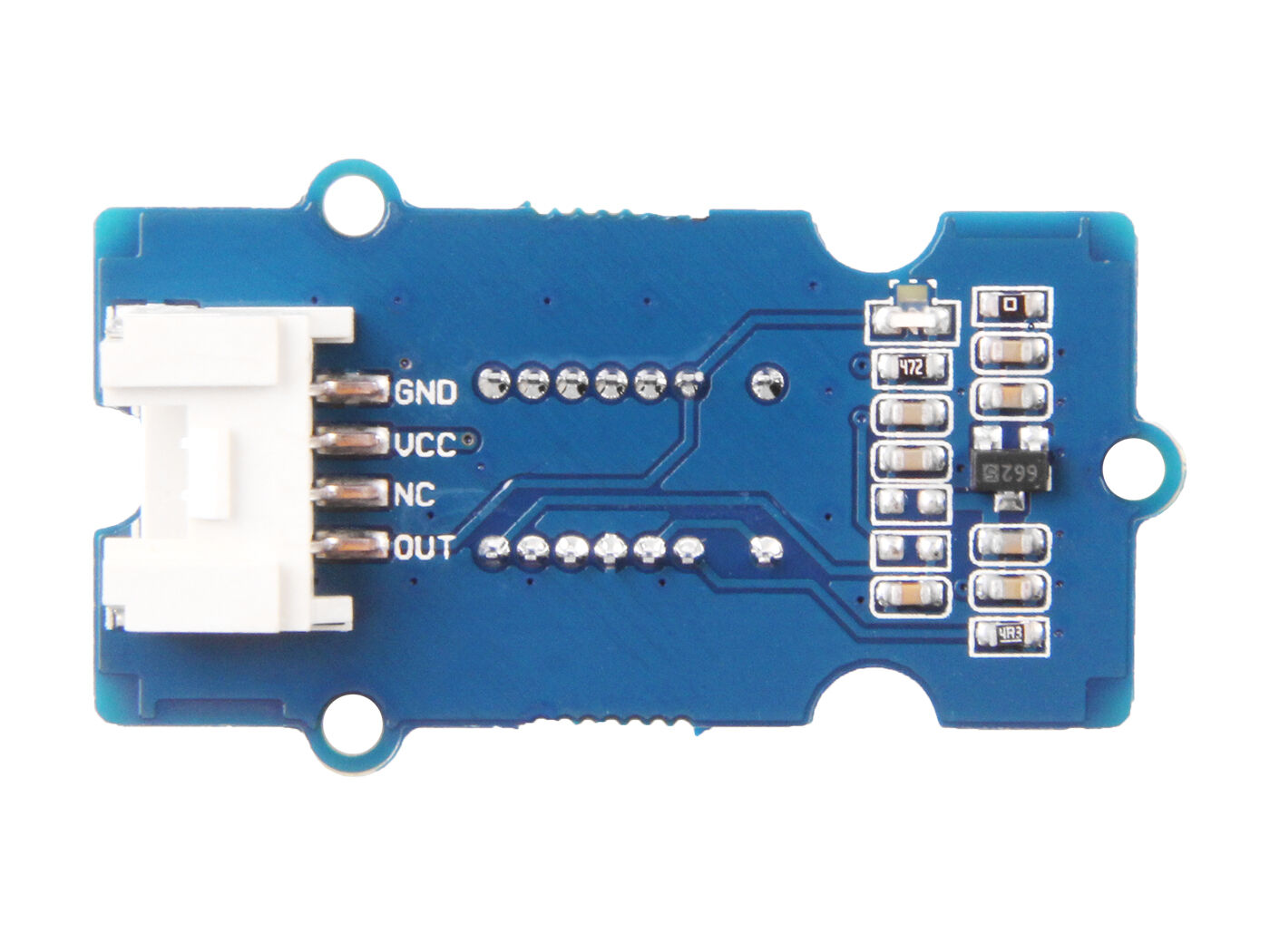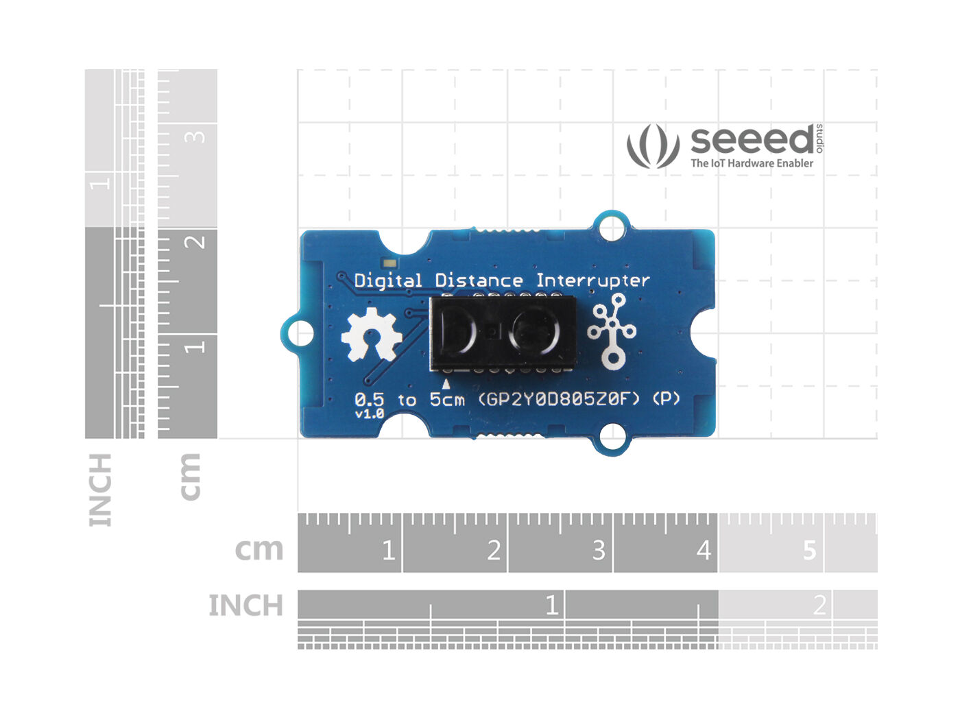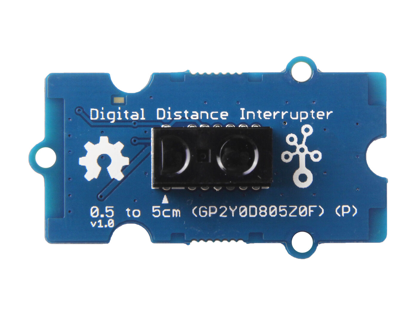 There are two types of Grove – Digital Distance Interrupter 0.5 to 5cm: Grove – Digital Distance Interrupter 0.5 to 5cm(GP2Y0D805Z0F) and Grove – Digital Distance Interrupter 0.5 to 5cm(GP2Y0D805Z0F)(P). For the version without letter P, the lens and the grove interface are at the same side; for the version with letter P, the lens and the grove interface are at the different sides. As you can see, this module is the ‘P’ version, if you want the lens and the grove interface at the same side, please click the Grove – Digital Distance Interrupter 0.5 to 5cm(GP2Y0D805Z0F)