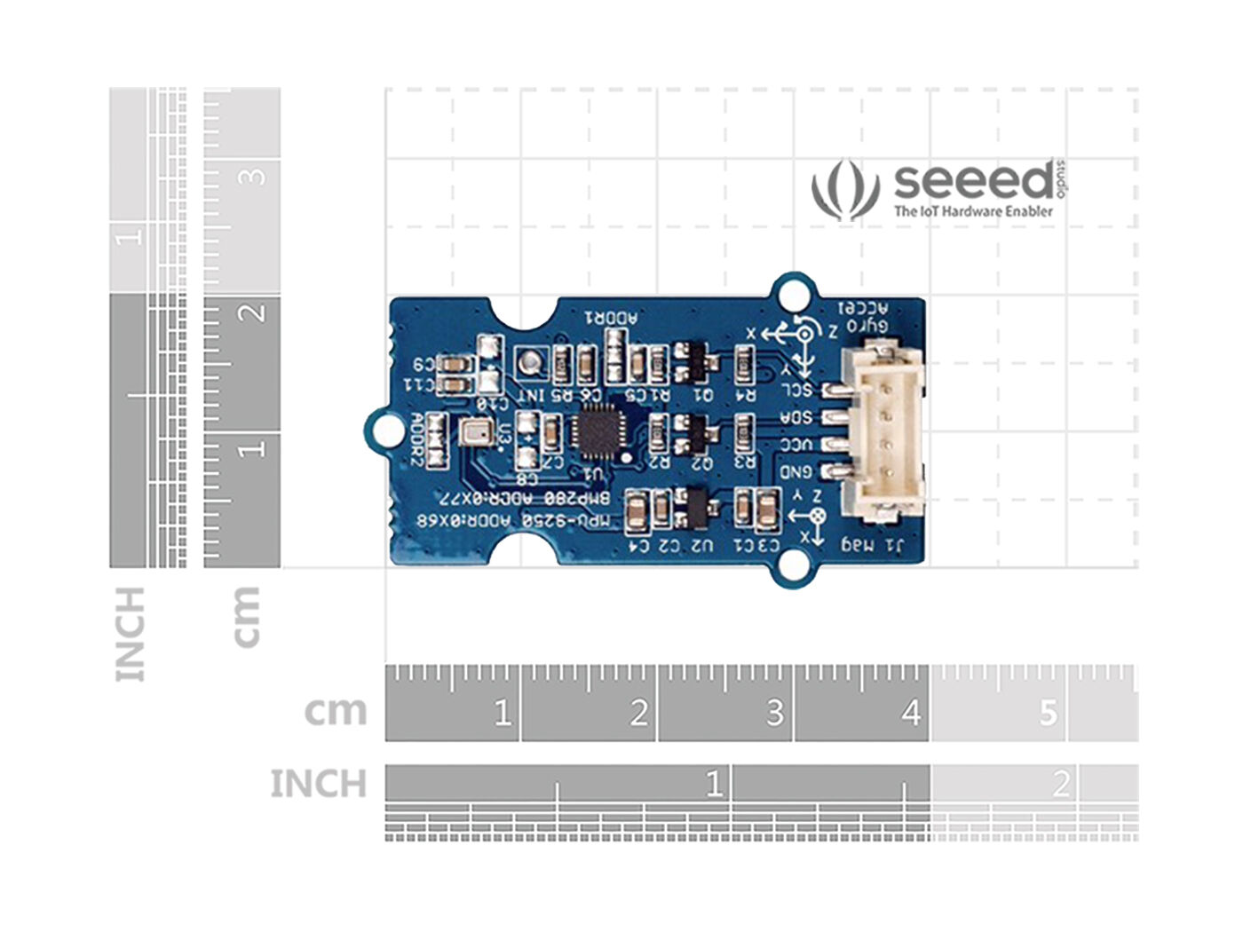 The Grove – IMU 10DOF V2.0 is based on MPU-9250 and BMP280.MPU-9250 is still the most compatible 9-aixs motion tracking device which combines a 3-axis gyroscope, 3-axis accelerometer, 3-axis magnetometer and a Digital Motion Processor (DMP) in a 3*3*1mm package. Regarding BMP280, the main change from Grove IMU 10DOF V1.0, this time it is housed in an extremely compact package that is 65% smaller than BMP180. Not just the size, the power consumption is even lower to be as low as 2.74uA@1Hz.
