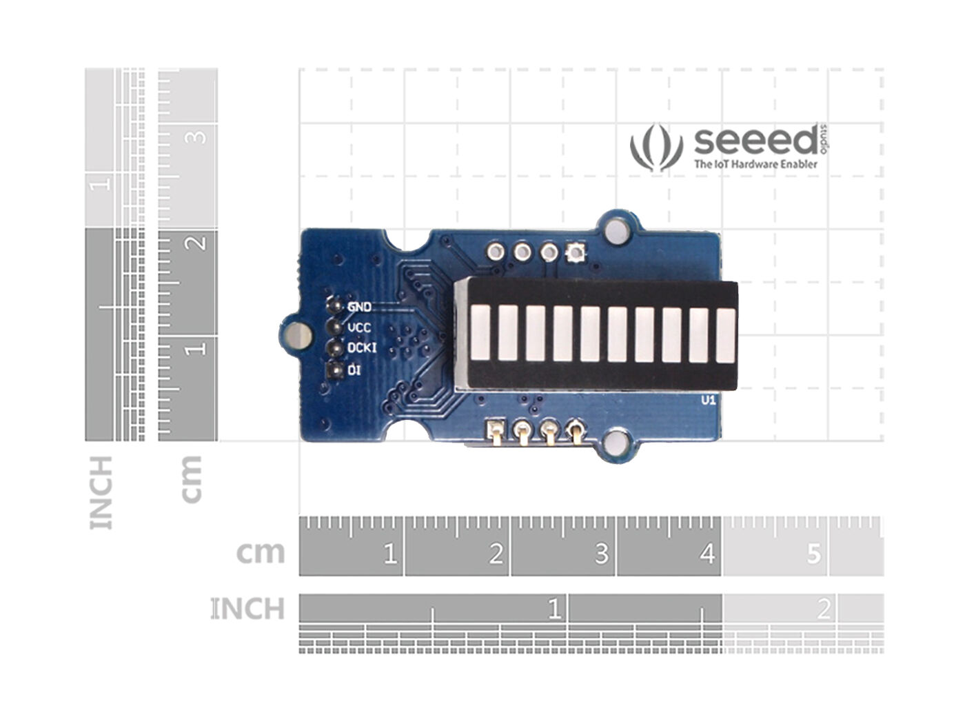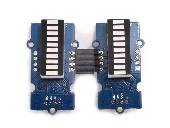 Grove – LED Bar is comprised of a 10 segment LED gauge bar and an MY9221 LED controlling chip. It can be used as a indicator for remaining battery life, voltage, water level, music volume or other values that require a gradient display. There are 10 LED bars in the LED bar graph: one red, one yellow, one light green, and the rest green. Demo code is available to get you up and running quickly. It lights up the LEDs sequentially from red to green, so the entire bar graph is lit up in the end. Want to go further? Go ahead and code your own effect.