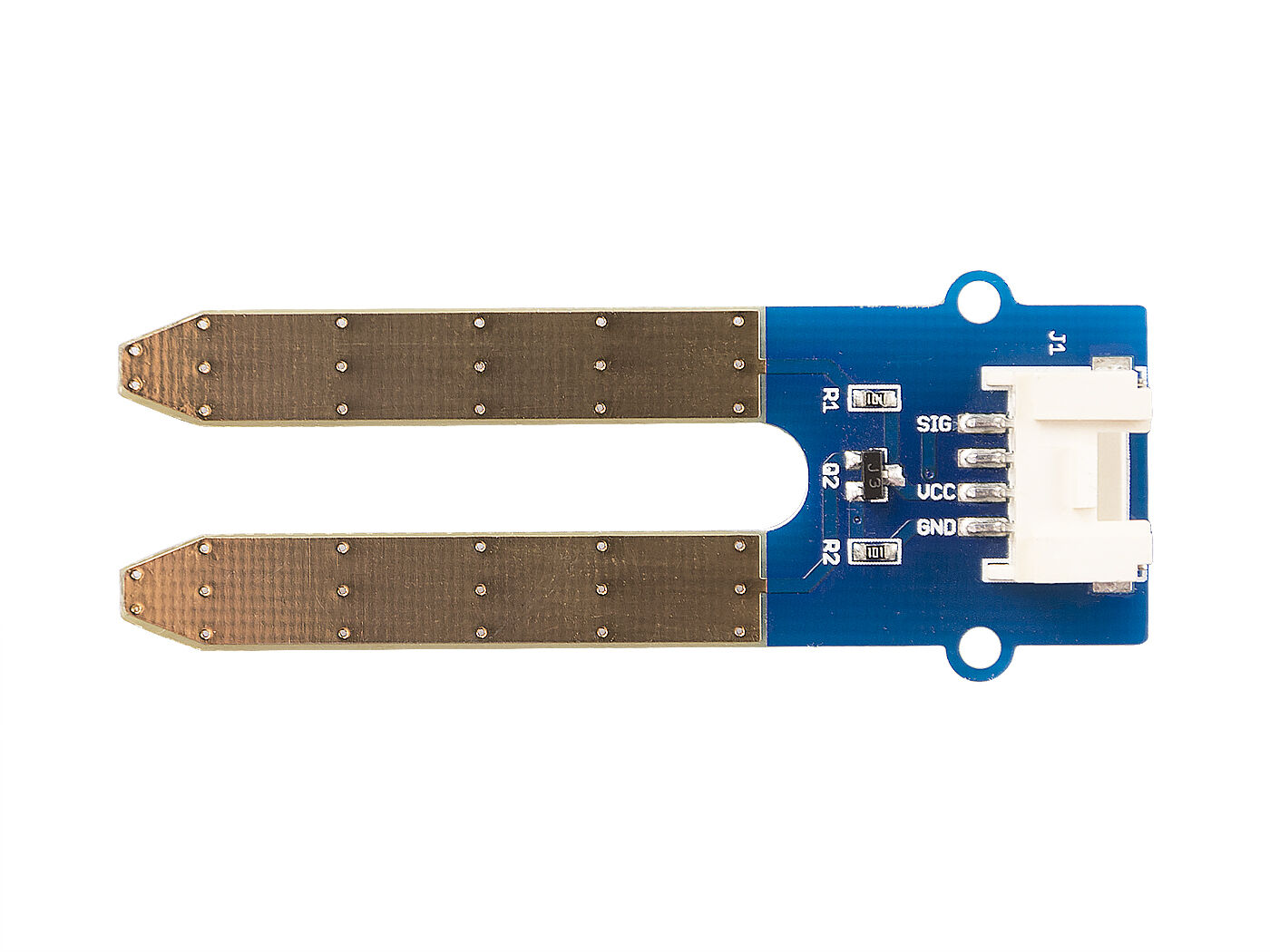 NOTE: This sensor is not hardened against contamination or exposure of the control circuitry to water and may be prone to electrolytic corrosion across the probes, please use it for PROTOTYPING ONLY. We also offer Grove – Capacitive Moisture Sensor with corrosion resistance.