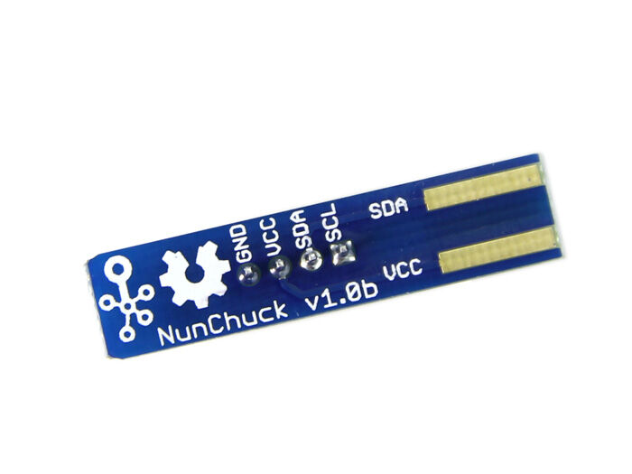 The Grove – NunChuck is a small PCB that adapts the Wii Nunchuck connector to standard Grove connector. The power, ground and two-wire interface of the Nunchuck are all broken out to a 4-pin 0.1"pitch header. This “Grove – NunChuck”, let you play with the Wii Nunchuck and other Wii remote peripherals without needing you to cut cables. Just plug it into the Wii Nunchuck, then into the Grove – Base Shield .