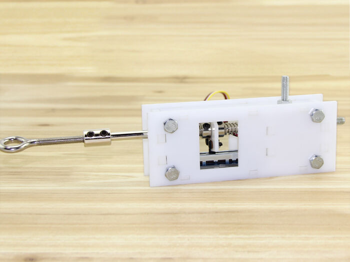 The force sensor uses a linear potentiometer to measure the displacement of a rod connected to a pair of springs. The displacement is related to the force applied to the rod. The springs can be replaced with more stiff or relaxed springs to adjust the sensitivity.