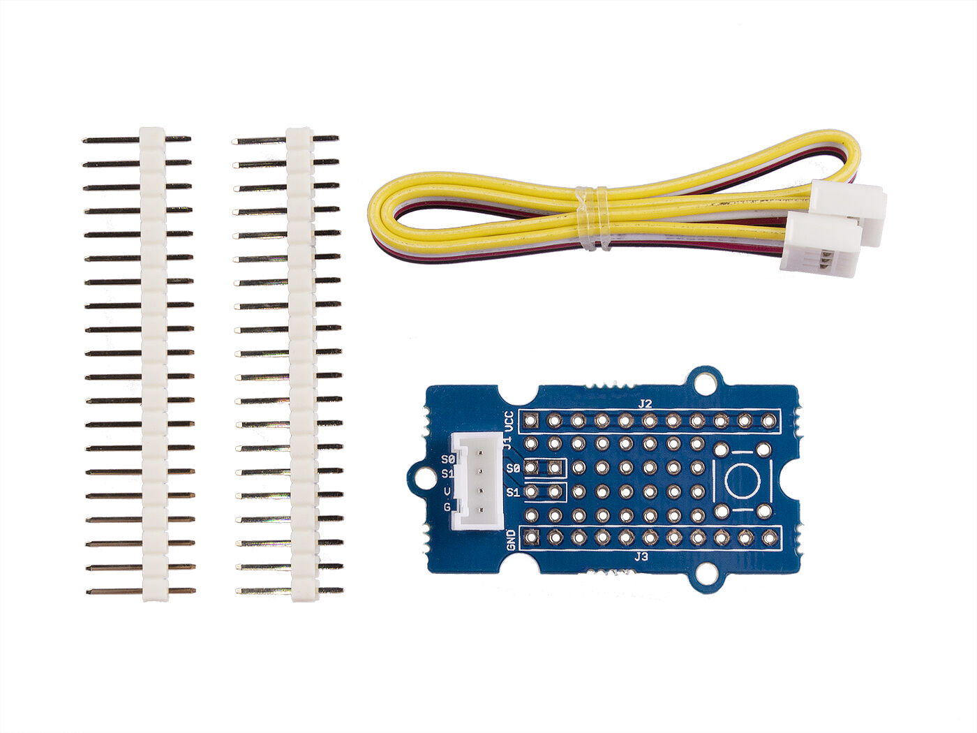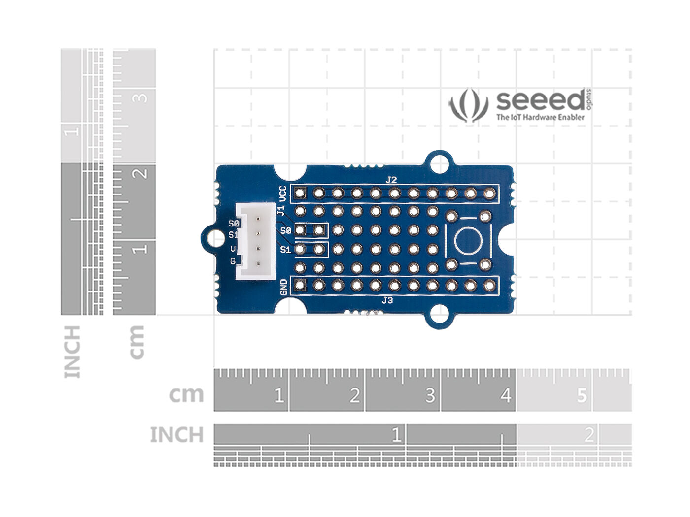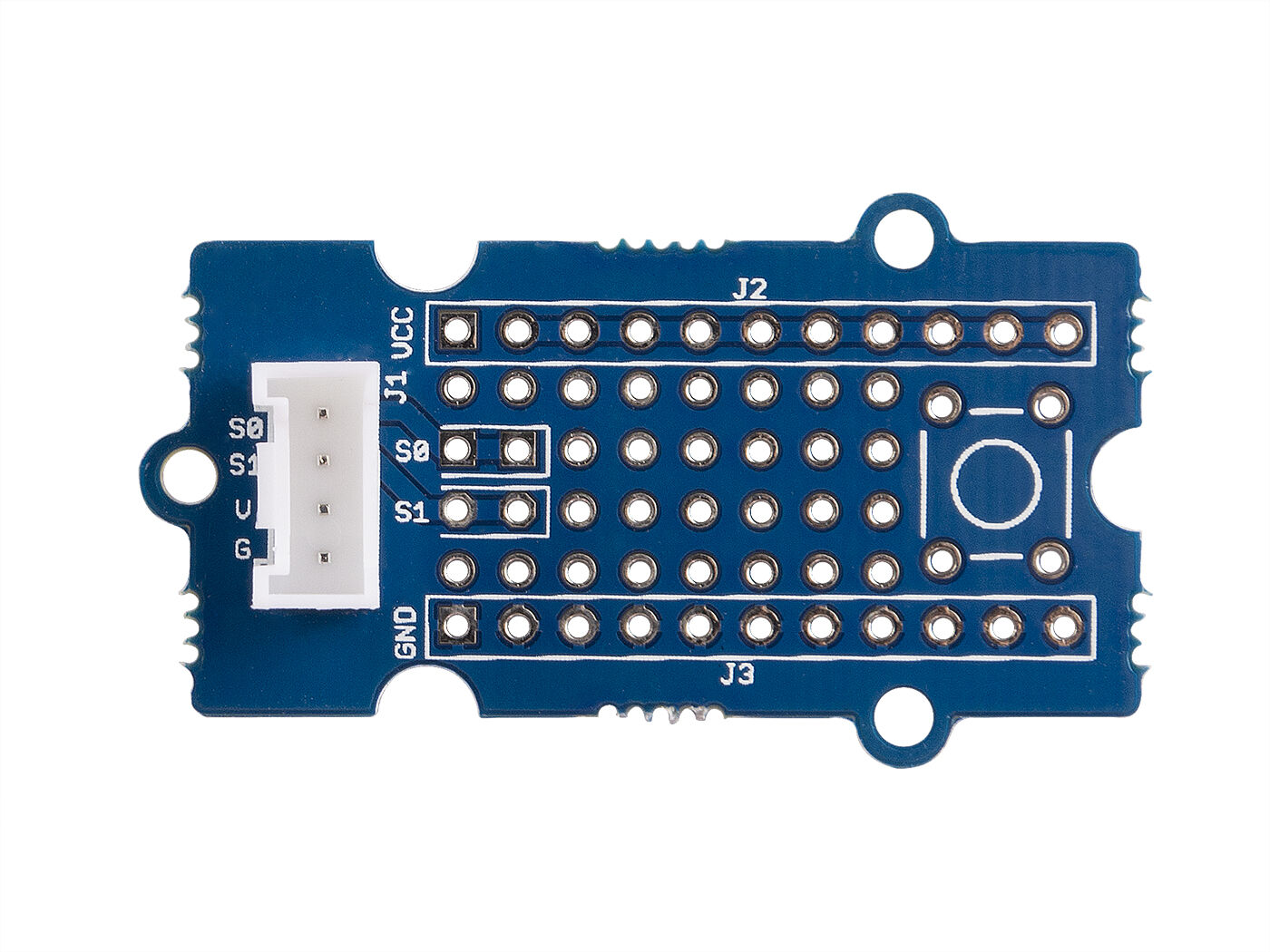 This Grove allows you to add your own circuitry or components to your Grove system prototypes. It gives you access to all four lines from the grove connector cable – S0, S1, VCC and GND. There is also a reserved space for a normally-open button. Standard 2.54mm spacing makes it easy to install normal DIP-format ICs and other components onto the board.