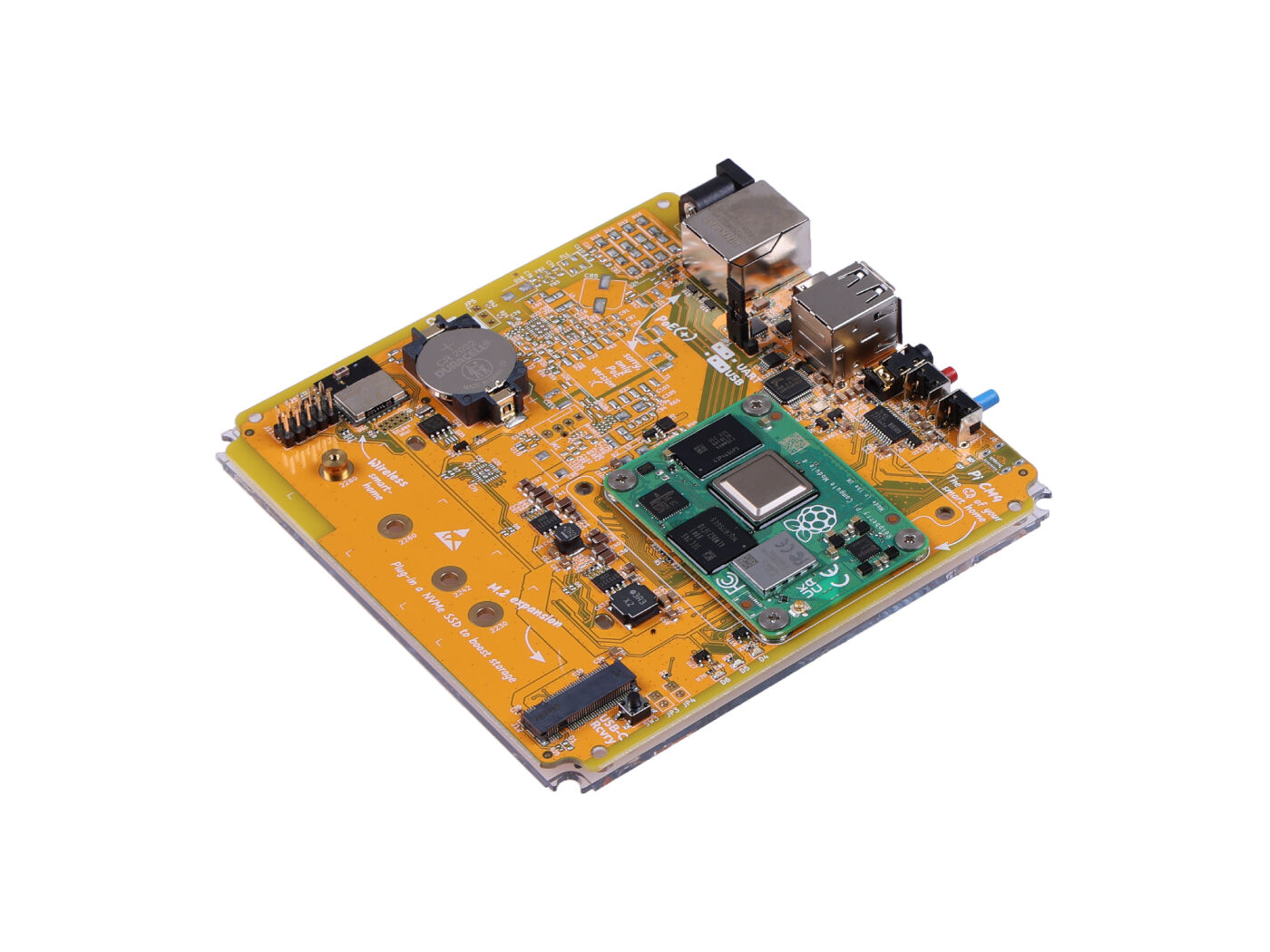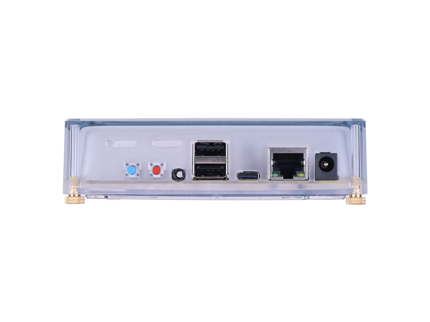 It includes an M.2 expansion port for NVMe SSD hard drive for expanding available space. It contains a gigabit Ethernet, 2 USB 2.0 Type-A host ports, and 1 USB-C 2.0 device port. It also has a high-quality stereo audio DAC with a 2V RMS line out on a 3.5mm audio jack.