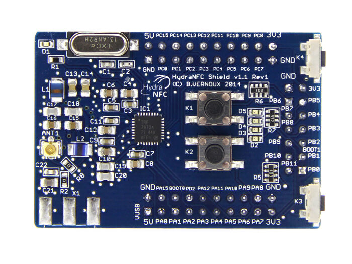 It has been designed to be used with HydraBus but can also be used with other MCU (breakout of all TRF7970A I/O).