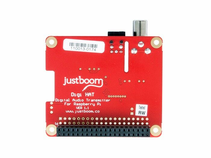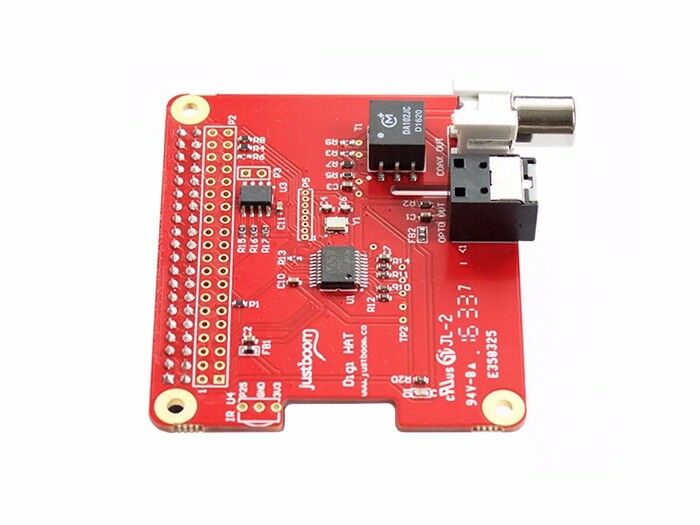 The JustBoom Digi HAT is a high resolution digital audio output add on board for the Raspberry Pi. Simply stack the plug-and-play add on board (HAT) onto your Raspberry Pi A+, B+, 2B or the new 3B and it will be ready to use immediately. The JustBoom Digi HAT produces an unmodified, high quality, digital audio data stream for bit-perfect transmission to your hifi system.
