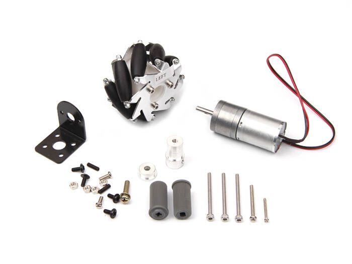 This kit is usually supposed to work together with other 3 Mecanum wheel kits (2 right, 1 left) in order to form an omni-directional mobile platform.