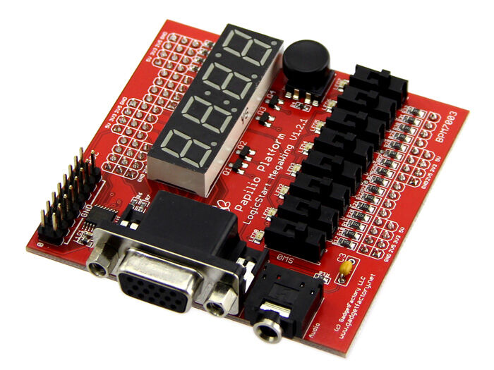 The LogicStartMegaWing provides everything needed to get started with VHDL and FPGA development on the Papilio with one convenient and easy to connect circuit board.