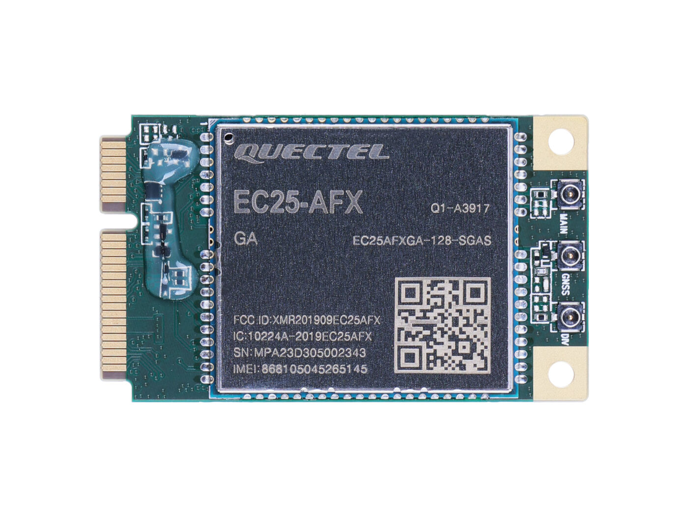 The LTE Cat 4 EC25-AFXGA-mini-PCIe is a Mini PCIe module that supports LTE-FDD and WCDMA mobile communication technologies and integrates multiple GNSS receivers for faster and more accurate positioning. All of these make it suitable for M2M and IoT applications.