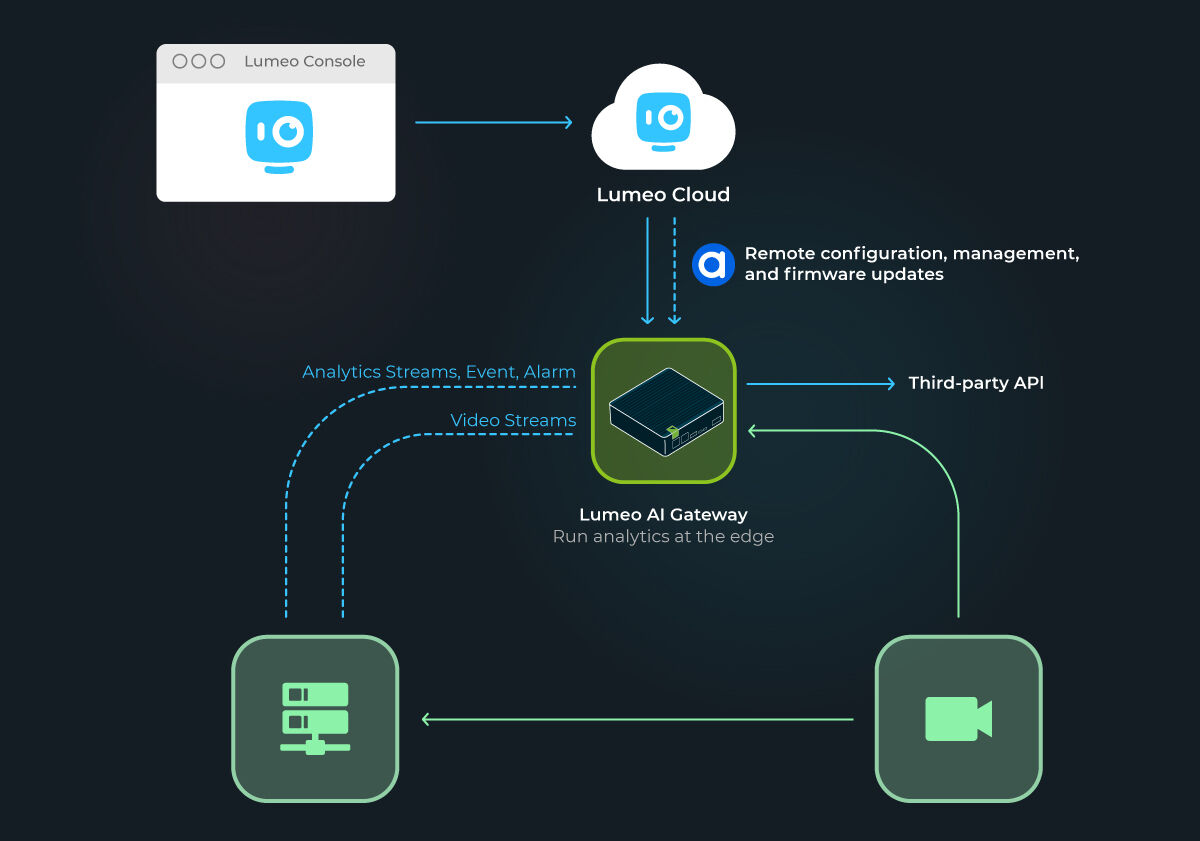 Lumeo streamlines the development & deployment of vision AI solutions. It simplifies tasks like camera control, video feed intake, processing, storage, AI model deployment, and using inference results for alerts, dashboards, 3rd party integrations including existing business intelligence systems.