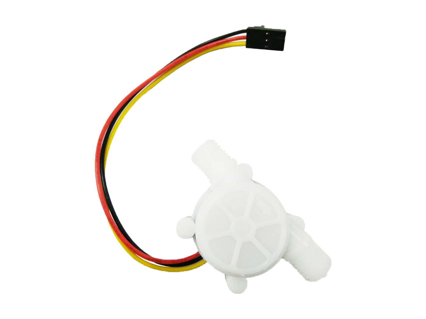 Water flow sensor consists of a plastic valve body, a water rotor, and a hall-effect sensor. When water flows through the rotor, rotor rolls. Its speed changes with different rate of flow. The hall-effect sensor outputs the corresponding pulse signal. This one is suitable to detect flow in water dispenser or coffee machine.