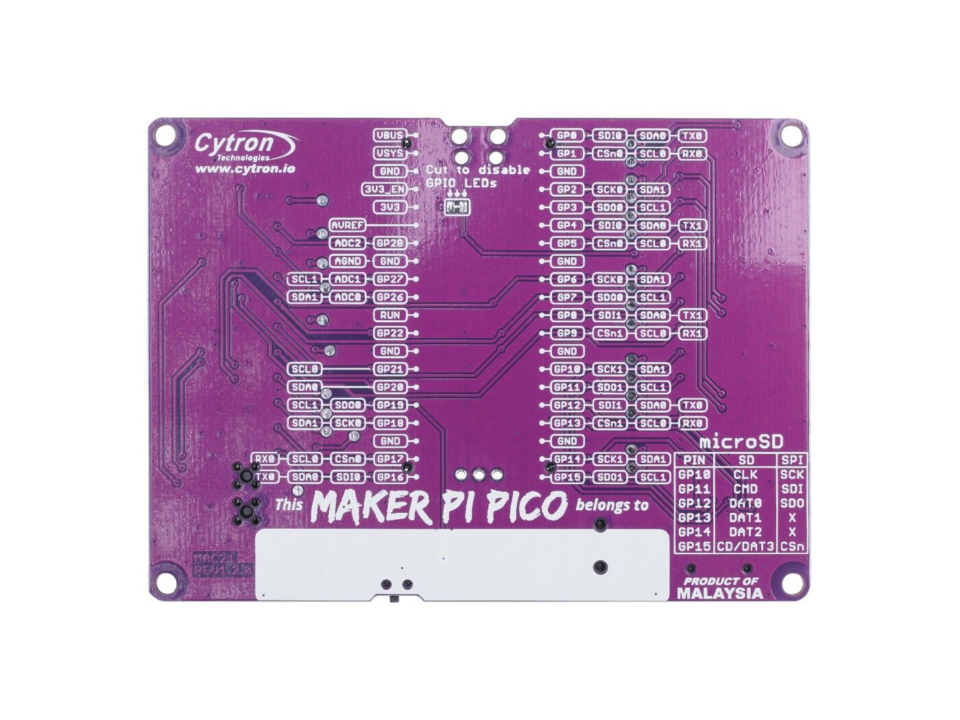 Maker Pi Pico Base incorporates the most wanted Reset button for your Raspberry Pi Pico and gives you access to all GPIO pins on two 20 ways pin-headers, with clear labels. Each GPIO is coupled with an LED indicator for convenient code testing and troubleshooting. The bottom layer of this board even comes with a comprehensive pinout diagram showing the function of each pin.