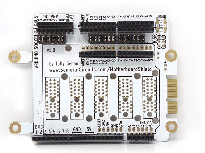 The PCB used for the Mama Shield can also be assembled as a card with an Arduino socket, thus we have "Mama Shield Card".  This way you can stack about three Arduino shields on one Arduino.