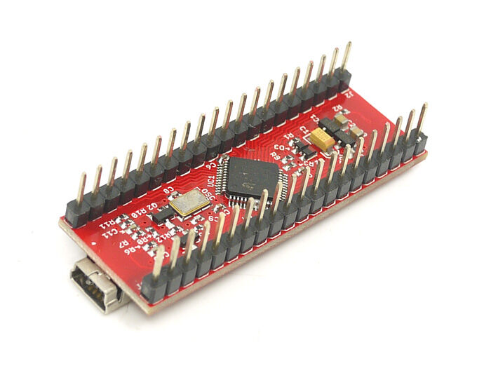 Maple Mini is a breadboard-able PCB for applications where space is limited or simply if a breadboard is the preferred prototyping tool. Smaller than a stick of gum, Maple Mini features a smaller, 48-pin STM32 with the same speed and memory as the original Maple, but 34 GPIOs. It can be powered by USB or an external supply. Maple Mini also maintains a complete silkscreen, making it uniquely detailed for a board its size.
