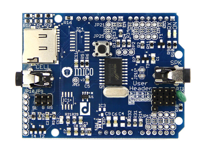 The MICO Shield makes it easy for you to create an Arduino project that interfaces with a cell phone. The Arduino &cell phone interface unlock a whole new world of possibilities: projects where your Arduino can place phone and receive phone calls.