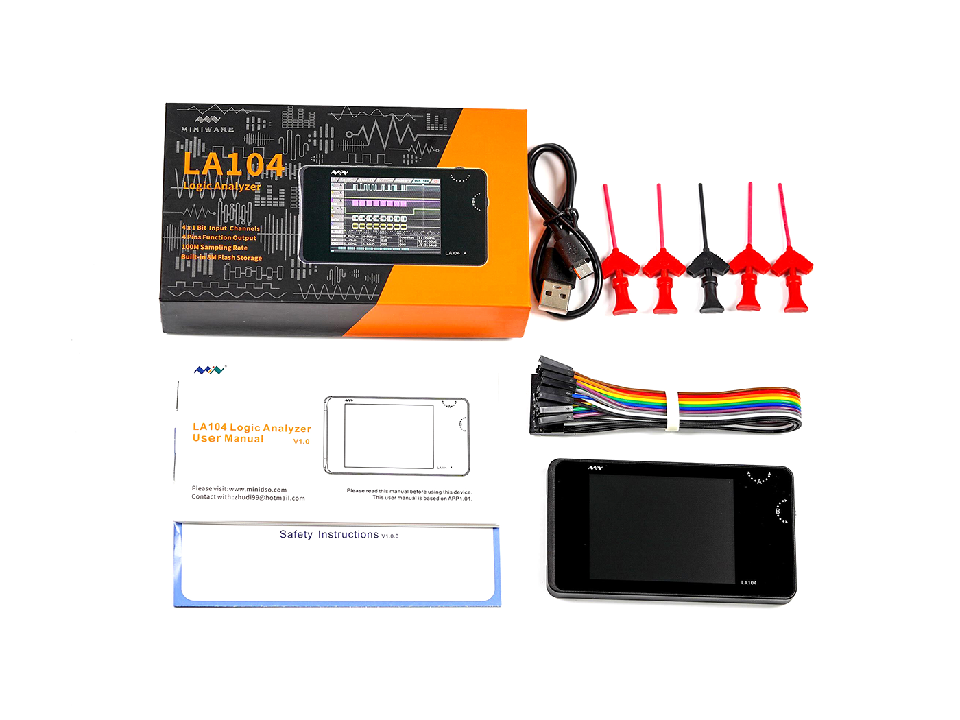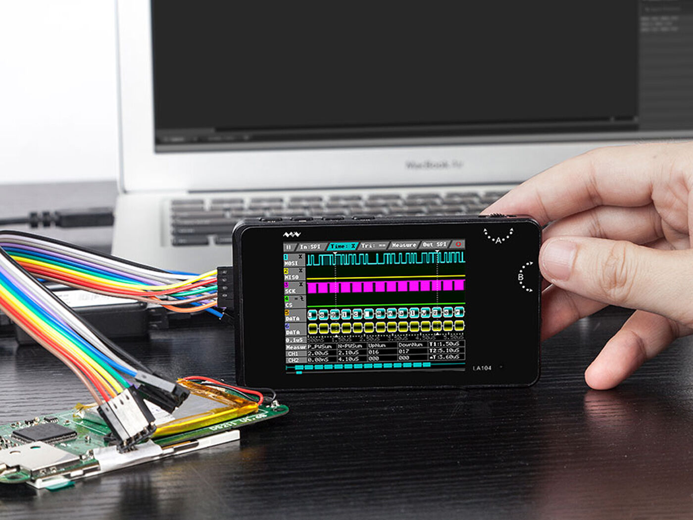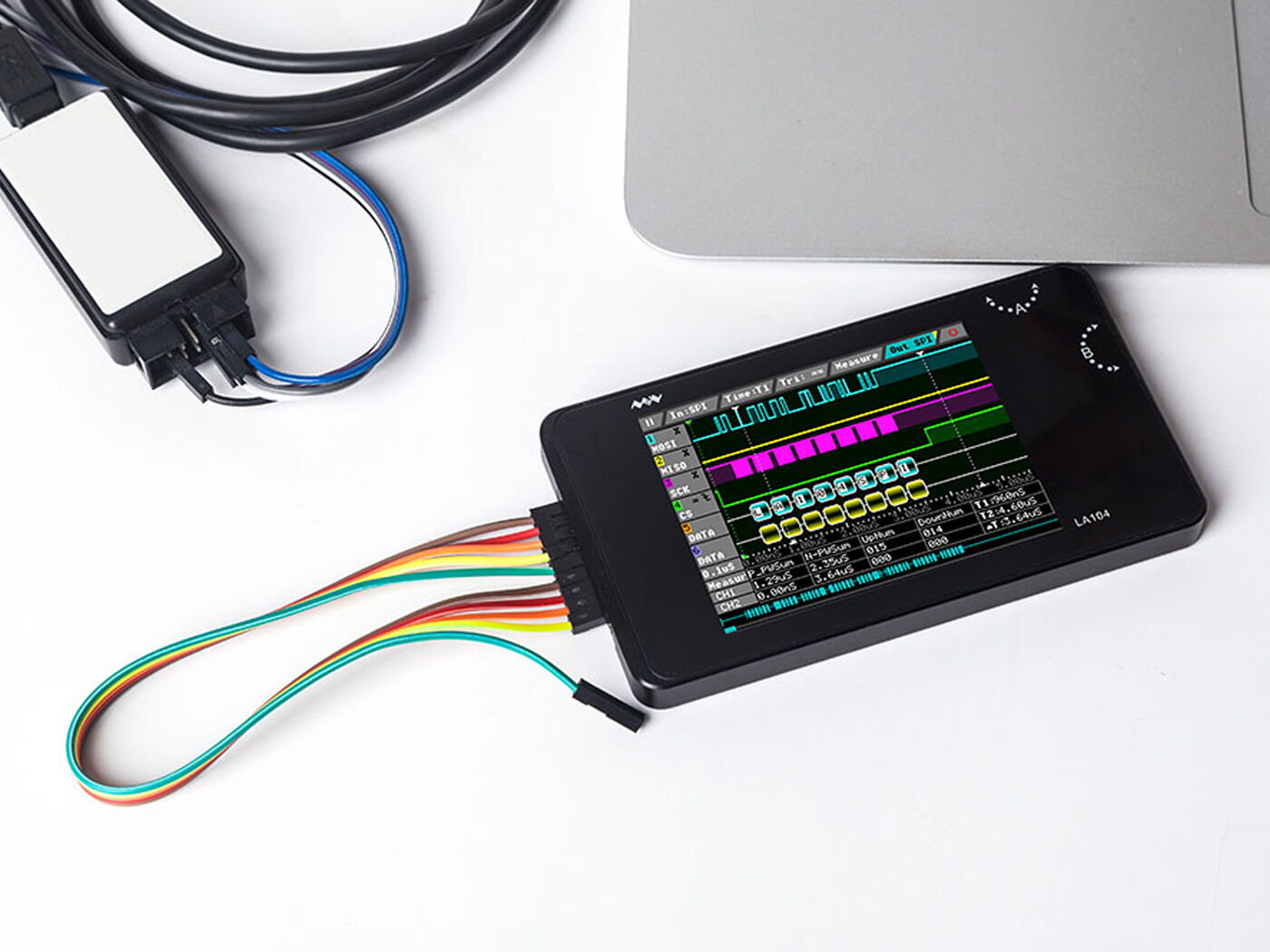 LA104 is a compact, portable logic analyzer with a display screen. It is widely applied to avariety of industries and fields, such as automotive electronics, communication, power supply and computer.