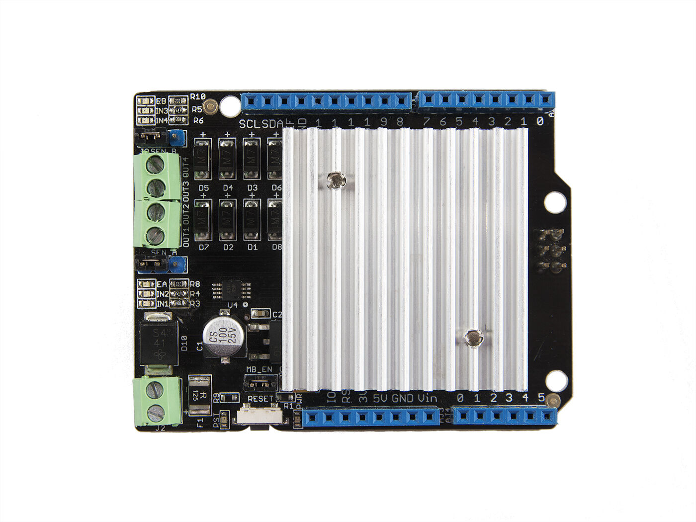 The Motor Shield is a driver module for motors that allows you to use Arduino to control the working speed and direction of the motor. Based on the Dual Full-Bridge Drive Chip L298, it is able to drive two DC motors or a step motor. The Motor Shield can either be powered directly by Arduino or by an external 5V~15V power supply via the DC jack. This module can be used for the development of microrobots and intelligent vehicles, etc.