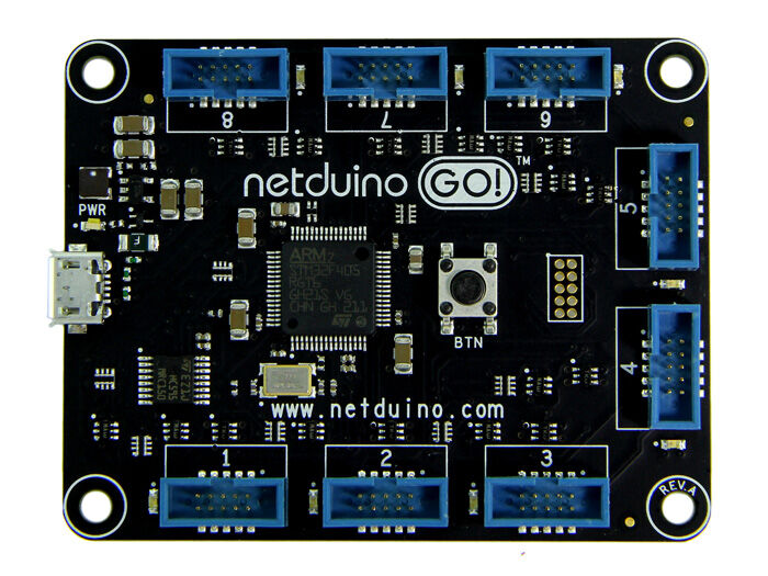 Netduino Go is a plug-and-play Netduino with support for more GPIOS, serial ports, analog inputs, and PWMs. Netduino Go has four times the speed (168MHz), six times the code space (384KB), and twice the available RAM (100KB+) of Netduino Plus.