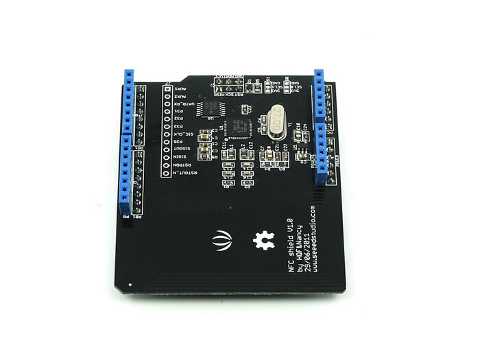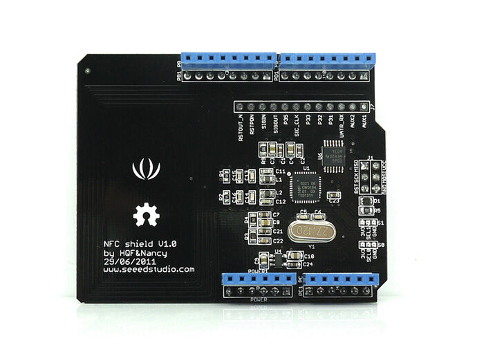 NFC Shield is a Near Field Communication interface for Arduino build around the popular NXP PN532 integrated circuit. NFC is a short-distance radio technology that enables communication between devices that are held close together. NFC traces its roots in RFID technology and is an open platform technology standardized in ECMA-340 and ISO/IEC 18092.