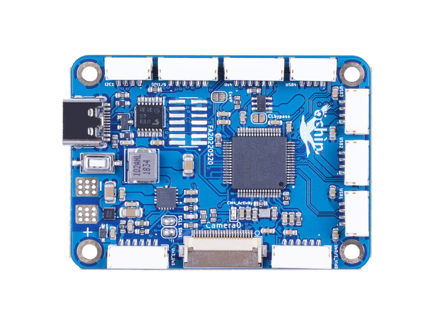 • Rich interfaces: 1×USB 2.0 port (highspeed);MIPI CSI-2: 1×2-lane MIPI CSI camera port, 1×4-lane MIPI CSI camera port; 1×USART, 3×UART, 1×I2C port, 1×SPI port, Analog Video Output