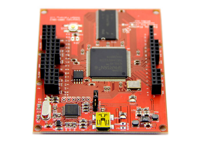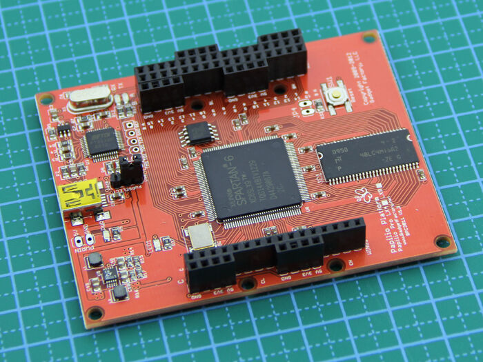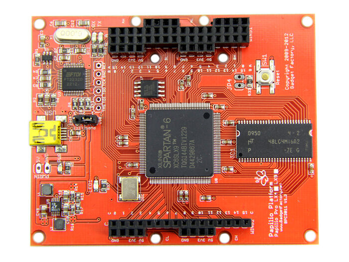 As the currently most powerful development board in Papilio series, Papilio Pro is based on Xilinx Spartan 6 LX FPGA. It offers exciting new features over Spartan 3, including up to 48 massive I/O lines, dual channel USB, integrated JTAG programmer, 64Mb large SDRAM, and an efficient switching power supply.
