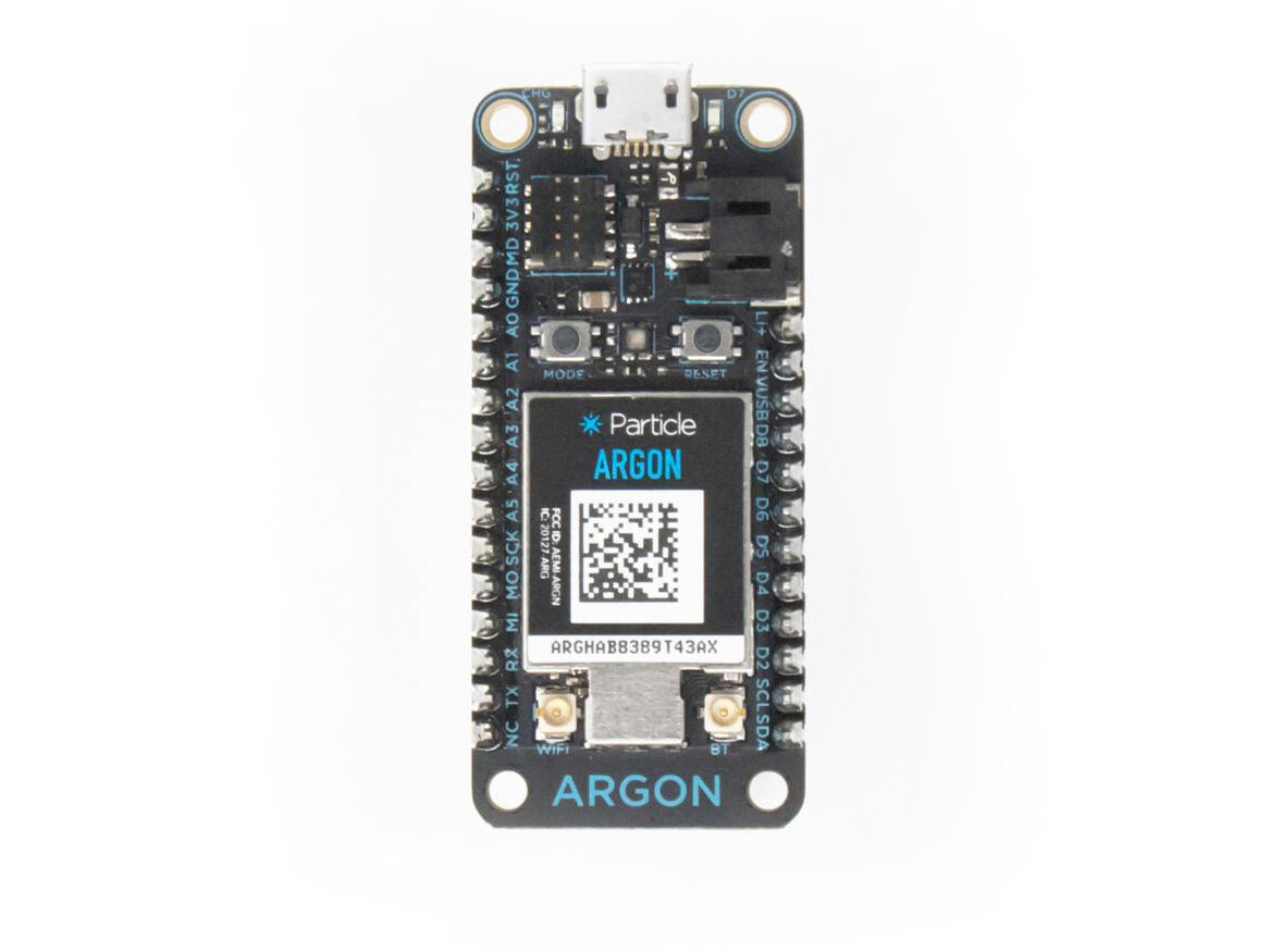 The Argon is a powerful Wi-Fi enabled development board that can act as either a standalone Wi-Fi endpoint or Wi-Fi enabled gateway for Particle Mesh networks. It is based on the Nordic nRF52840 and has built-in battery charging circuitry so it’s easy to connect a Li-Po and deploy your local network in minutes.