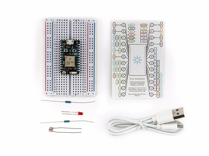 The Photon Kit includes a Photon with headers, a shiny white mini-breadboard, a USB-micro cable, and a couple of extra surprises to help you start building right away.