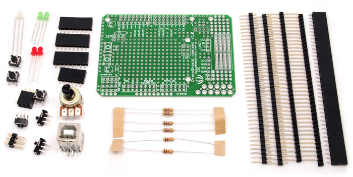 Basic components included (buttons, switches, LEDs, resistors, USB jack)