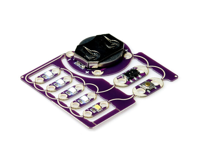 The ProtoSnap E-Sewing Kit pairs a LilyPad coin cell breakout board with a switch, a button, and five LEDs. It comes pre-wired so you can plug in a battery and use the switch and button to turn the LEDs on and off. Once you’ve mastered using the board together, break off the individual components and use them just like you would with their normal LilyPad counterparts.